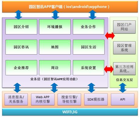 园区智讯APP平台。定位于高科技园区公共信息服务的终端集成化应用。平台集成门户网站信息资源、移动客户端的新闻推送、热点关注与消息定制的三位一体资源整合。支持园区政策申请、项目追溯、行政审批管理等移动政务、移动商务的应用和管理。